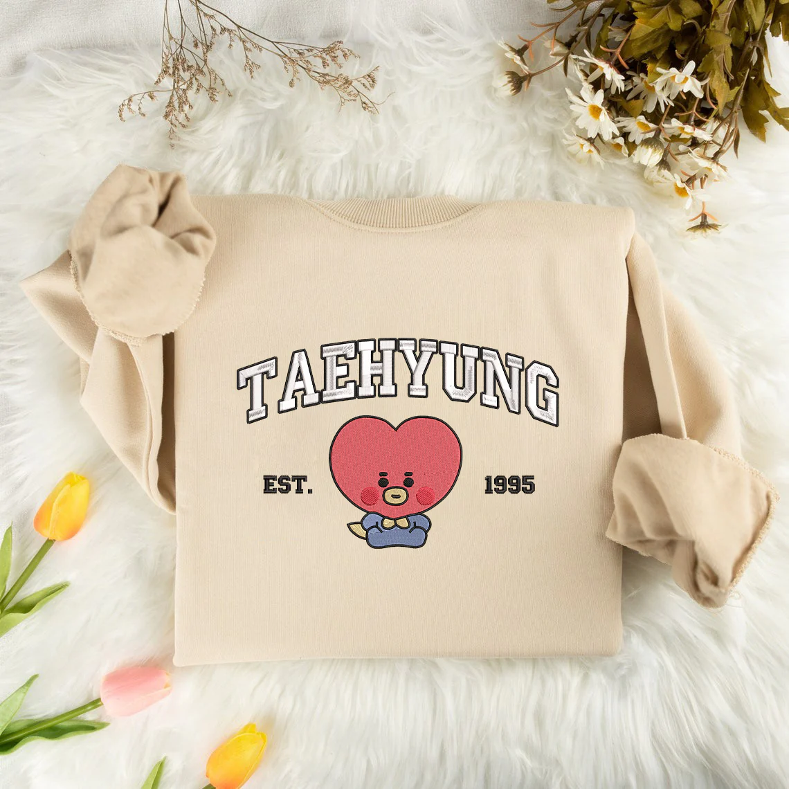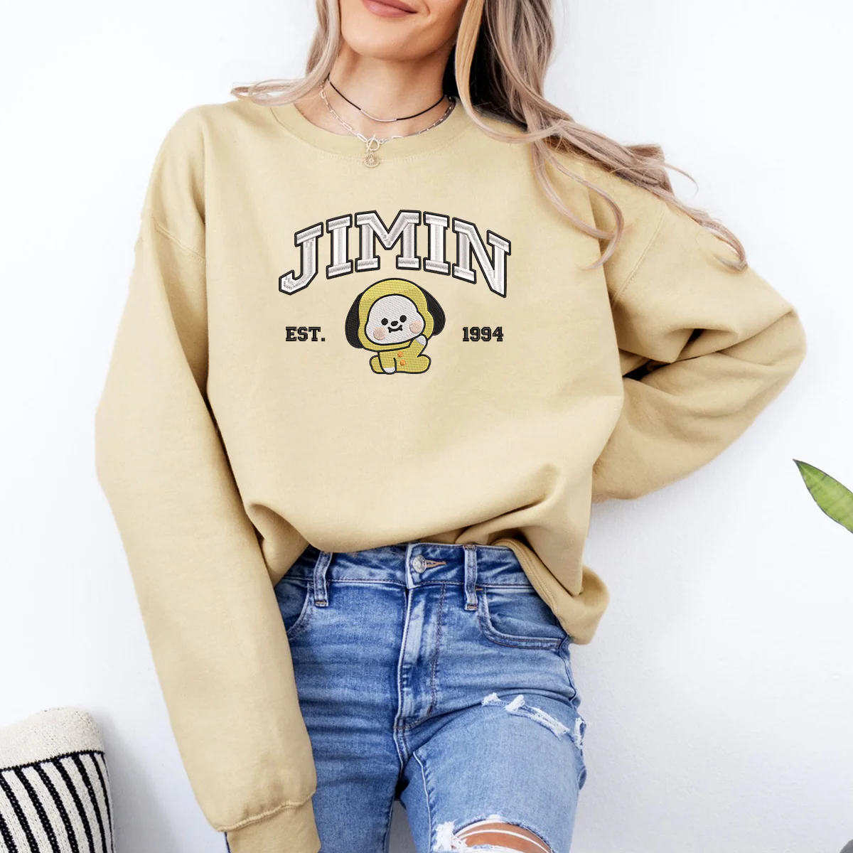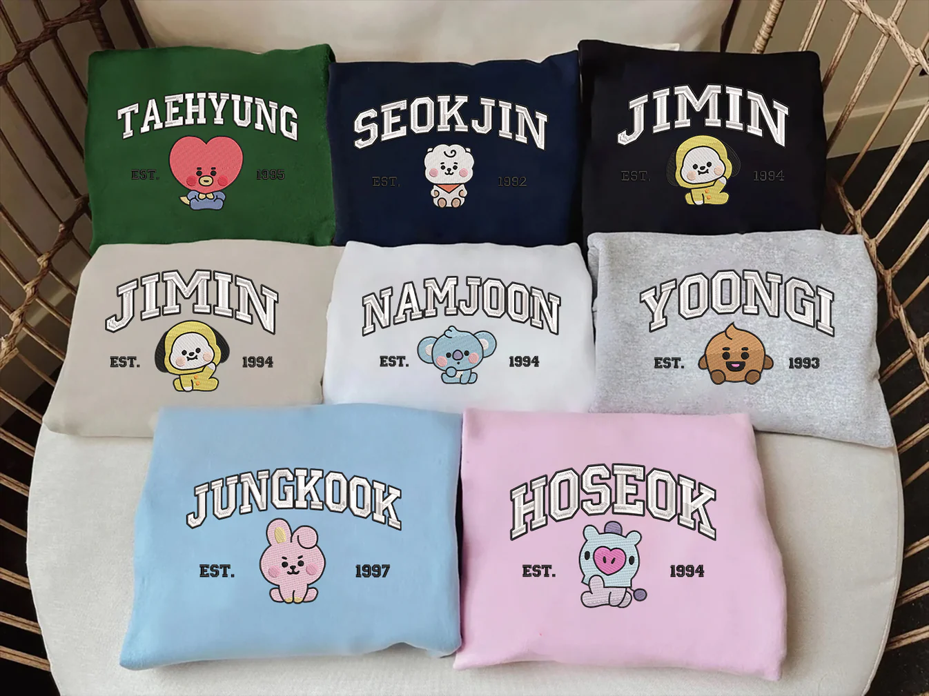 What makes this sweatshirt truly special is the machine-embroidered design that features the adorable BT21 characters, each one representing a beloved BTS member. Alongside each character is an “EST” label followed by the member’s birth year.