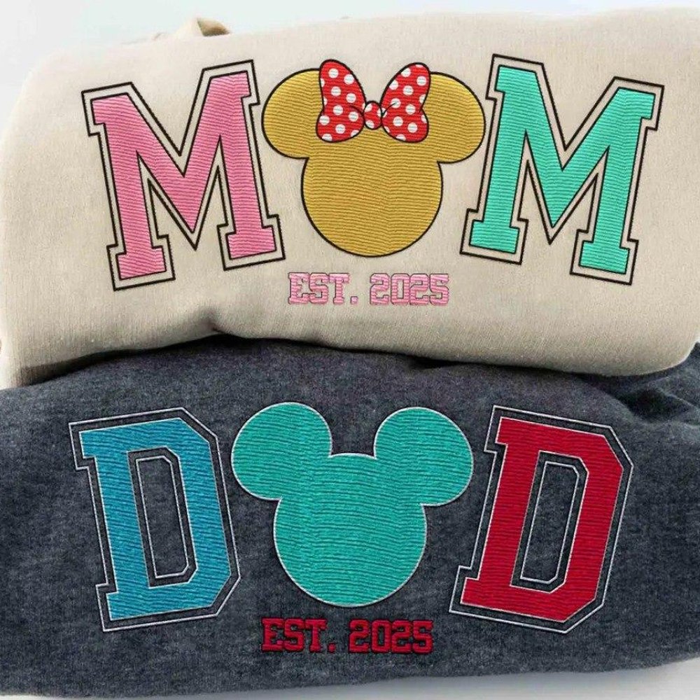 What makes the Mom & Dad Mickey Mouse Embroidered Sweatshirt truly stand out is its beautifully detailed and colorful embroidery. For moms, the sweatshirt showcases the word “MOM” with the letter “O” replaced by a golden yellow Minnie Mouse head featuring a red polka-dot bow. The surrounding “M” letters are embroidered in soft pink and mint green with bold black outlines, creating a stylish and cheerful contrast. Underneath, the words “EST. 2025” are embroidered in a delicate pink font, marking the special year that forever changed your life.