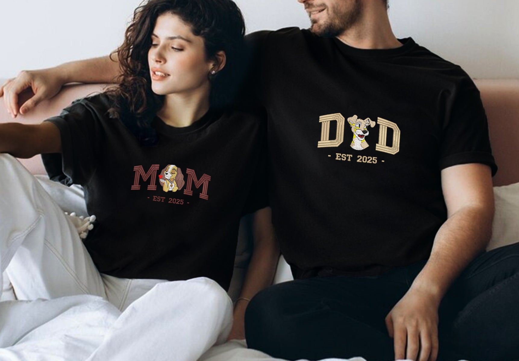 Our design boasts high-quality embroidery, beautifully capturing the beloved canine figures with intricate details and warm tones. This matching apparel is an ideal way for parents to express their shared excitement and love for their new “little one” joining the family. Whether chosen as cozy sweatshirts for cooler days, versatile hoodies, or comfortable t-shirts, these garments offer both style and a deeply personal, heartwarming sentiment.