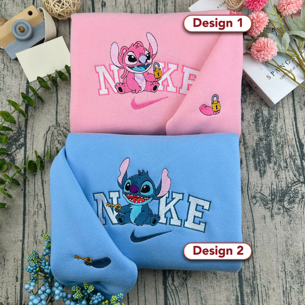 Stitch And Angel Key to My Heart Couple Embroidered Sweatshirt, Nike Couple Embroidered Hoodies