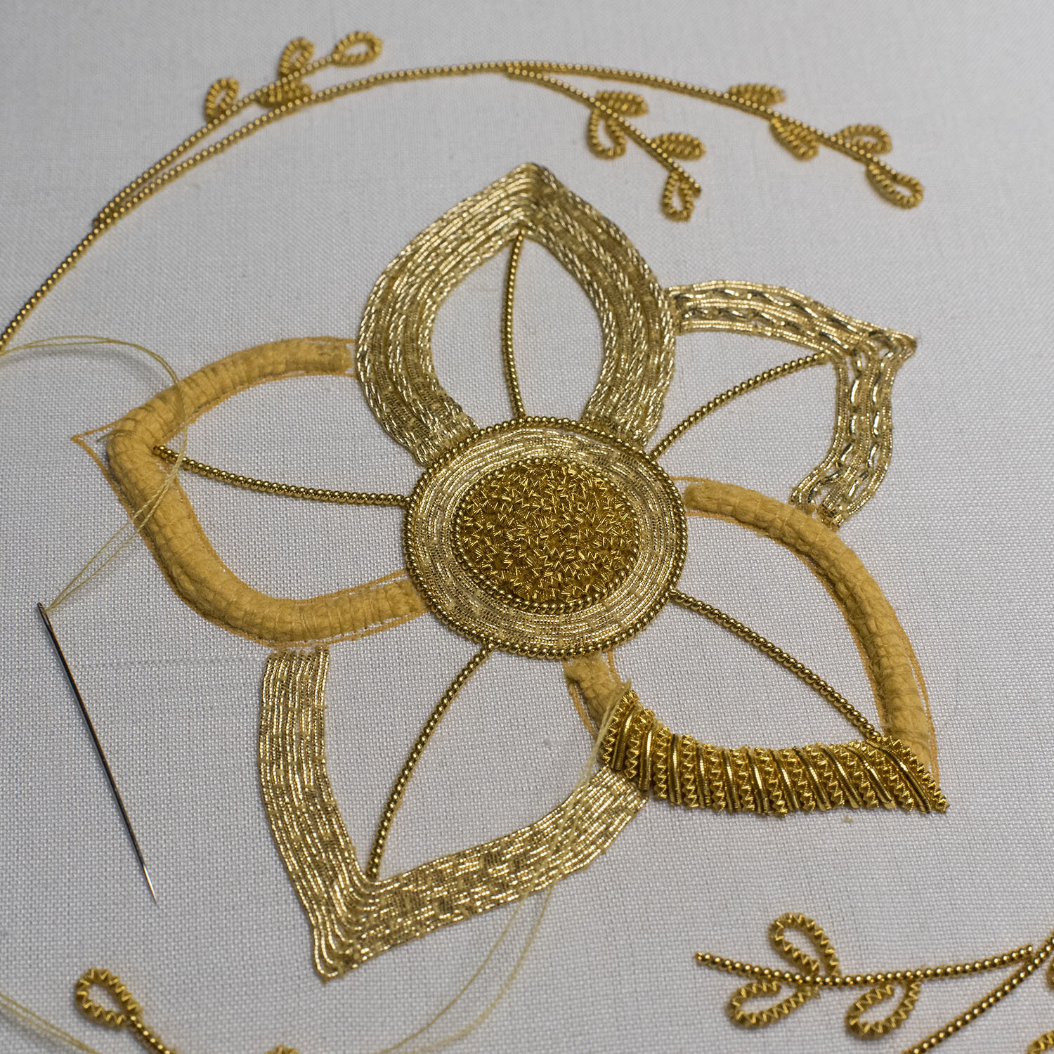 Goldwork is an opulent embroidery technique that involves using gold, silver, or metallic threads to create luxurious and intricate patterns. Historically, goldwork was reserved for royalty and religious garments due to its rich appearance and high cost.